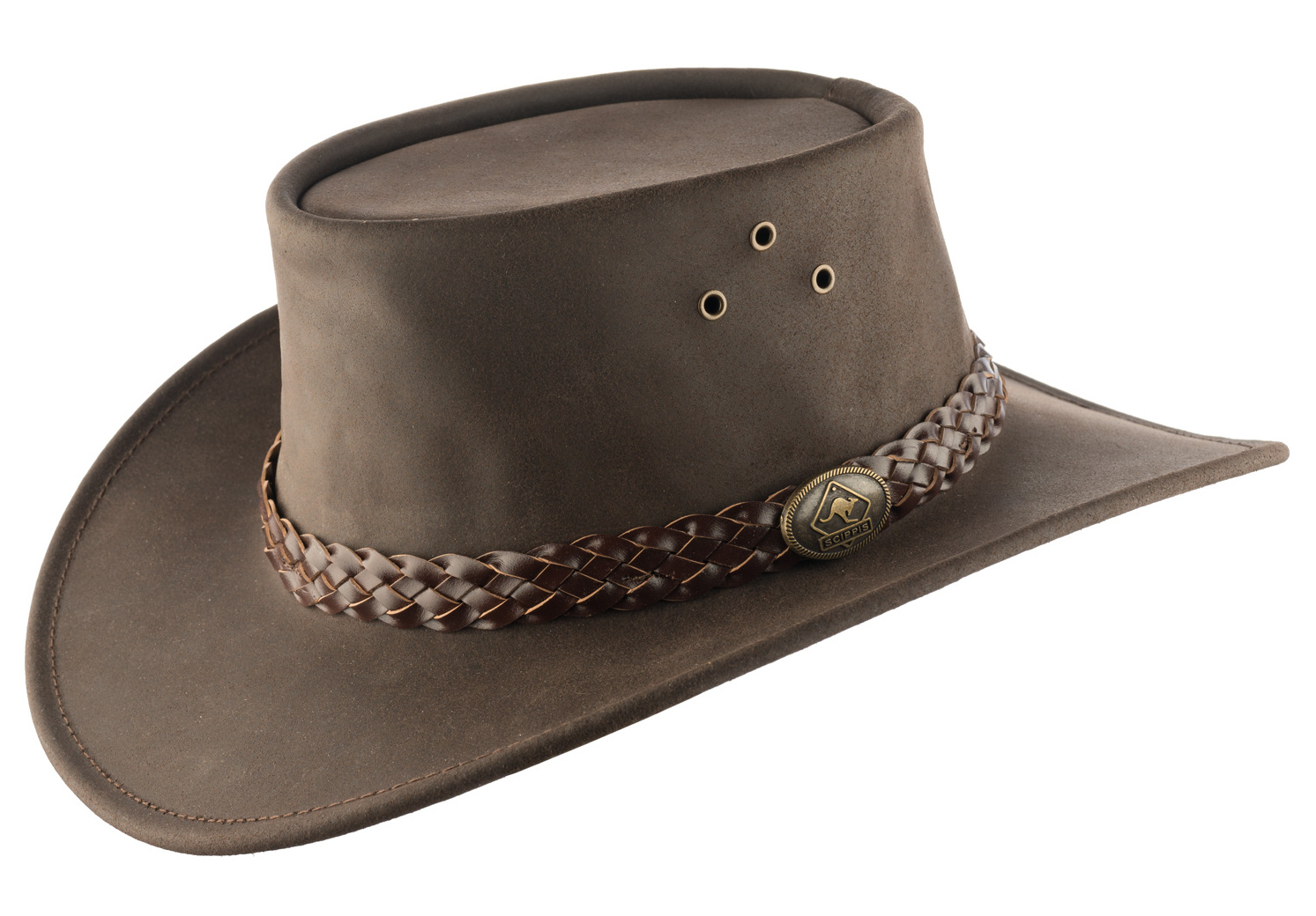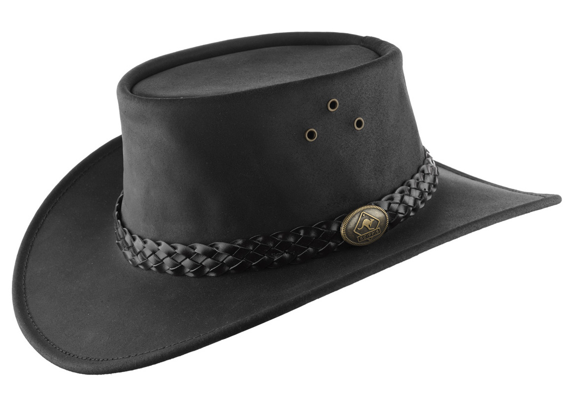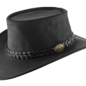 Vyroben z pevné a robustní hovězí kůže. Klobouk zdobí propracovaný čtyřdílný pletený pásek z mírně světlejší hovězí kůže. Zakřivení klobouku dodává typický australský vzhled.