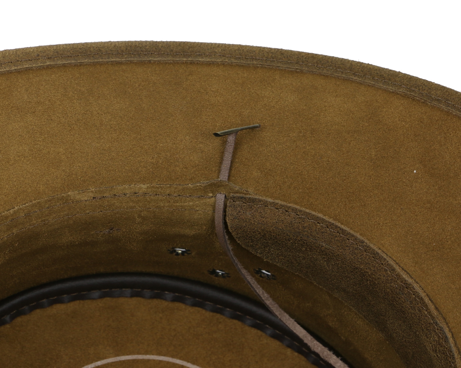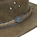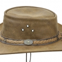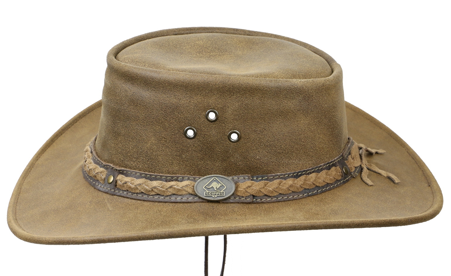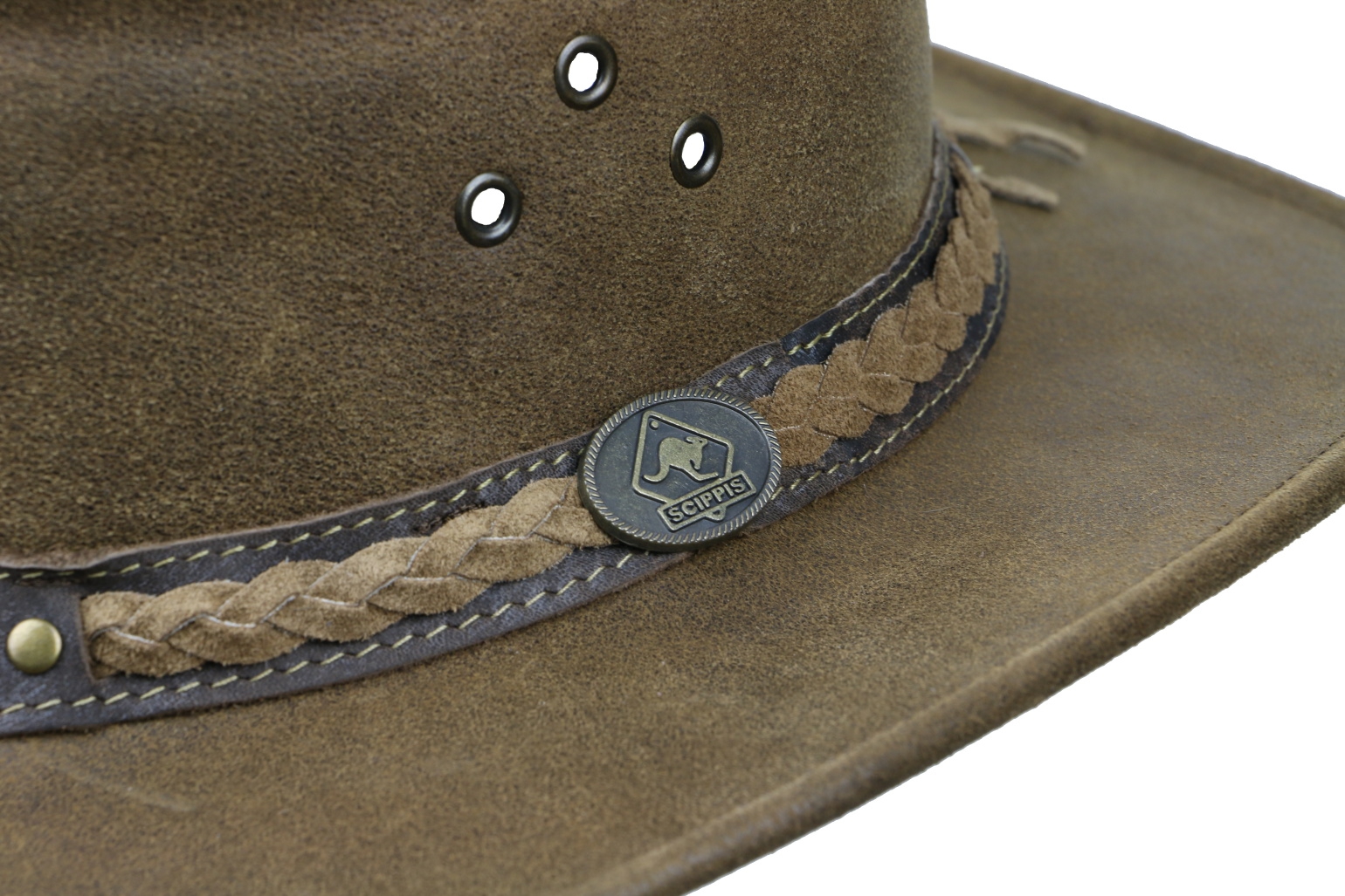 Je vybaven praktickými očky pro snadné odvětrání v horkých dnech. Ozdoben pleteným páskem z pravé kůže a kovovým logem SCIPPIS.