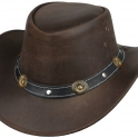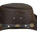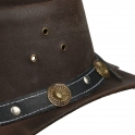 Je ozdoben conchos a páskem z pravé kůže. Má praktická očka pro snadné odvětrání v horkých dnech.