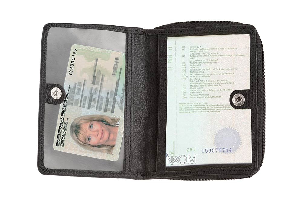Dvě přihrádky na bankovky, sedm slotů na bankovní karty, tři průhledné prostory na ID karty (velikost OP, TP).