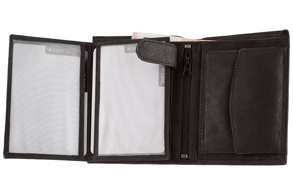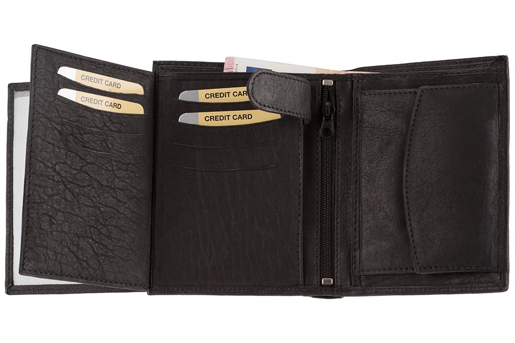 Dva lehce přístupné zabezpečené sloty na bankovní karty a osm dalších slotů ve vnitřní části peněženky. Dvě průhledné přihrádky na ID karty (velikost TP). Tři přihrádky uvnitř z nichž je jedna bezpečnostní s uzavřením na zip, jedna na mince s uzavřením na patent a jedna otevřená.