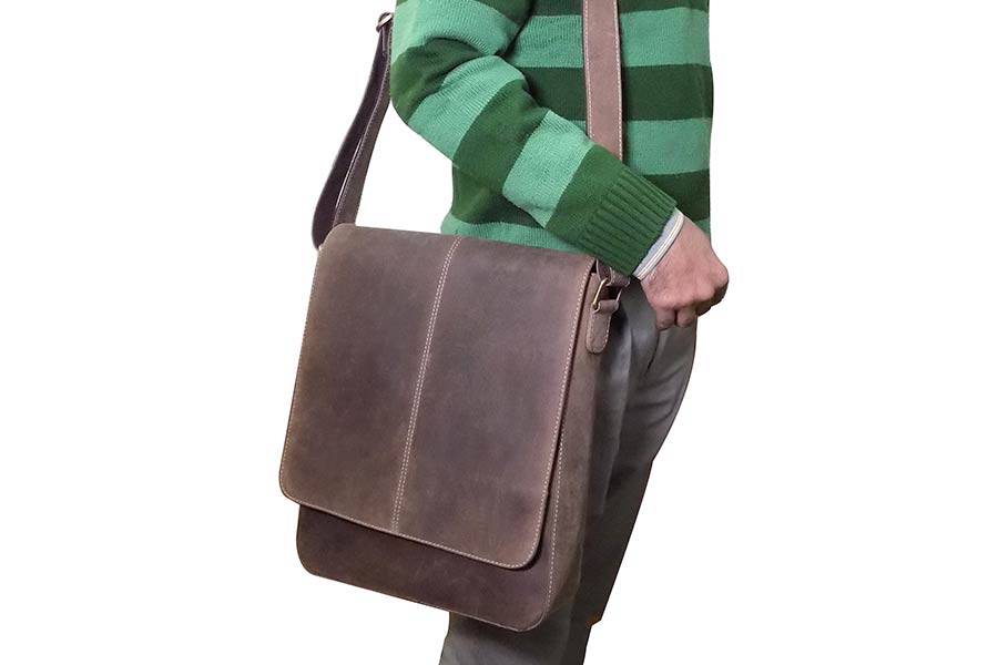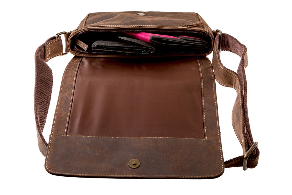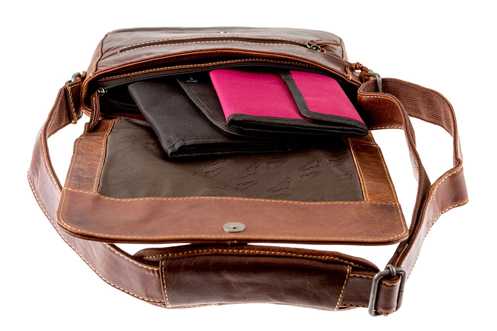 Kožená taška středně velké velikosti je vhodná pro dokumenty a složky ve velikosti A4 a pro malé notebooky a tablety.