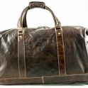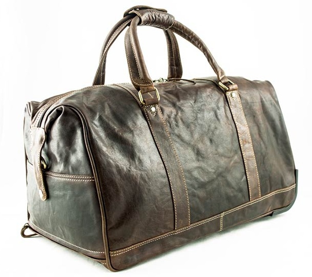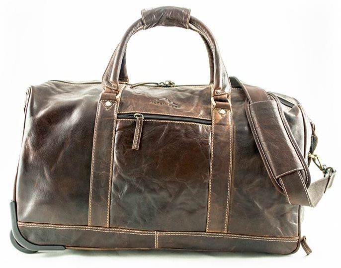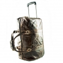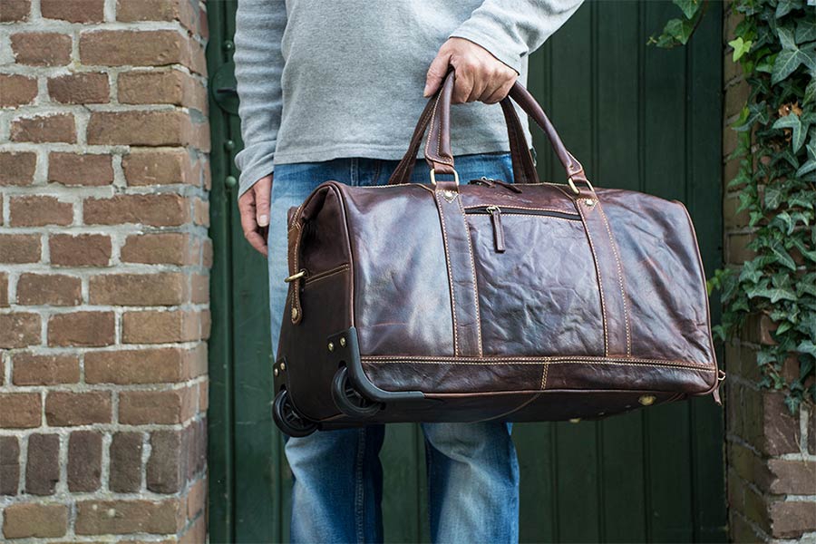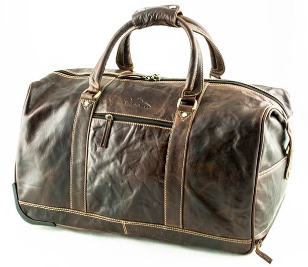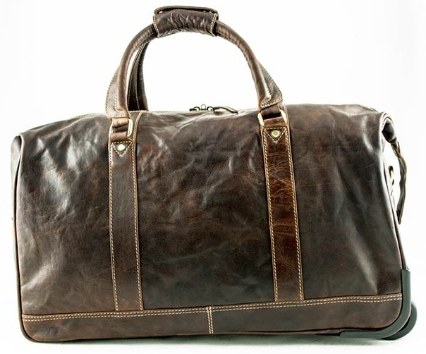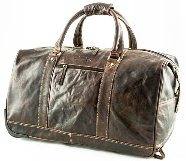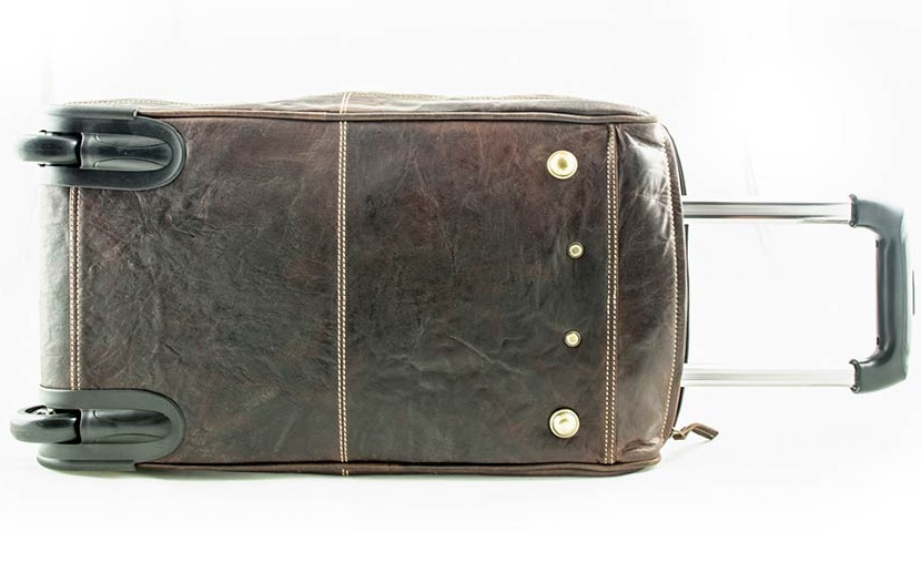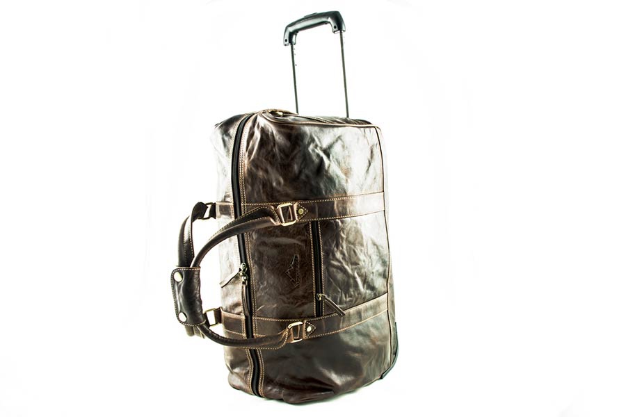 Cestovní kožená taška na kolečkách s vysouvací rukojetí.