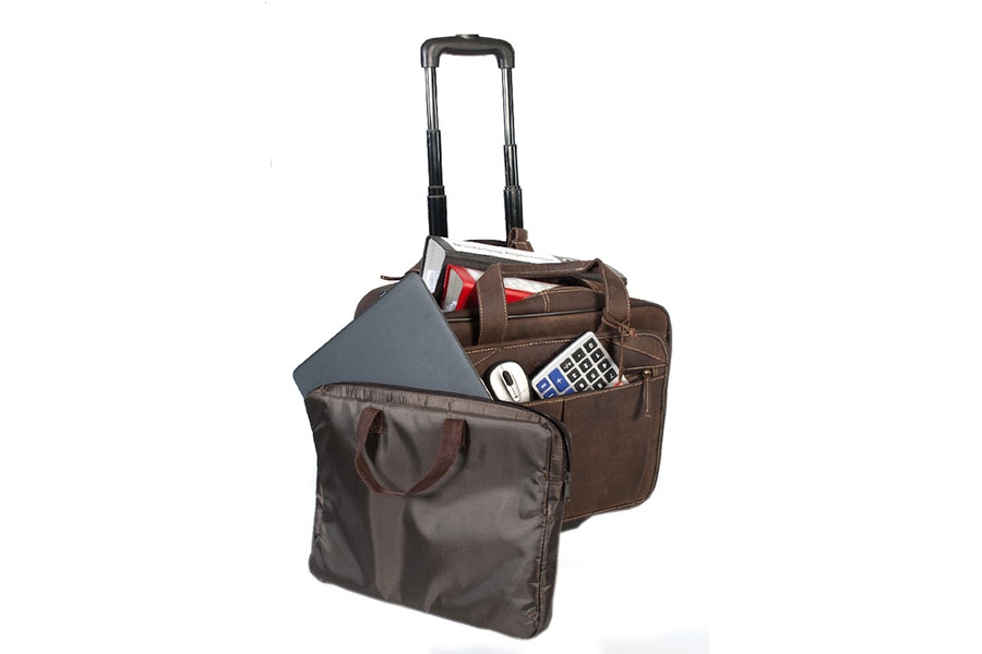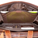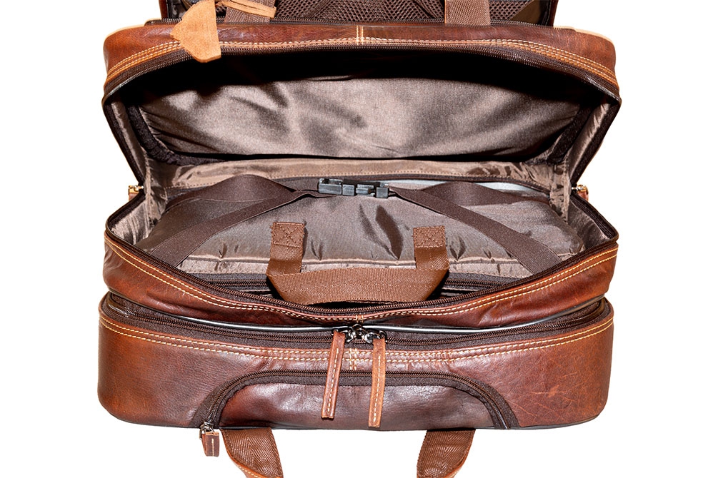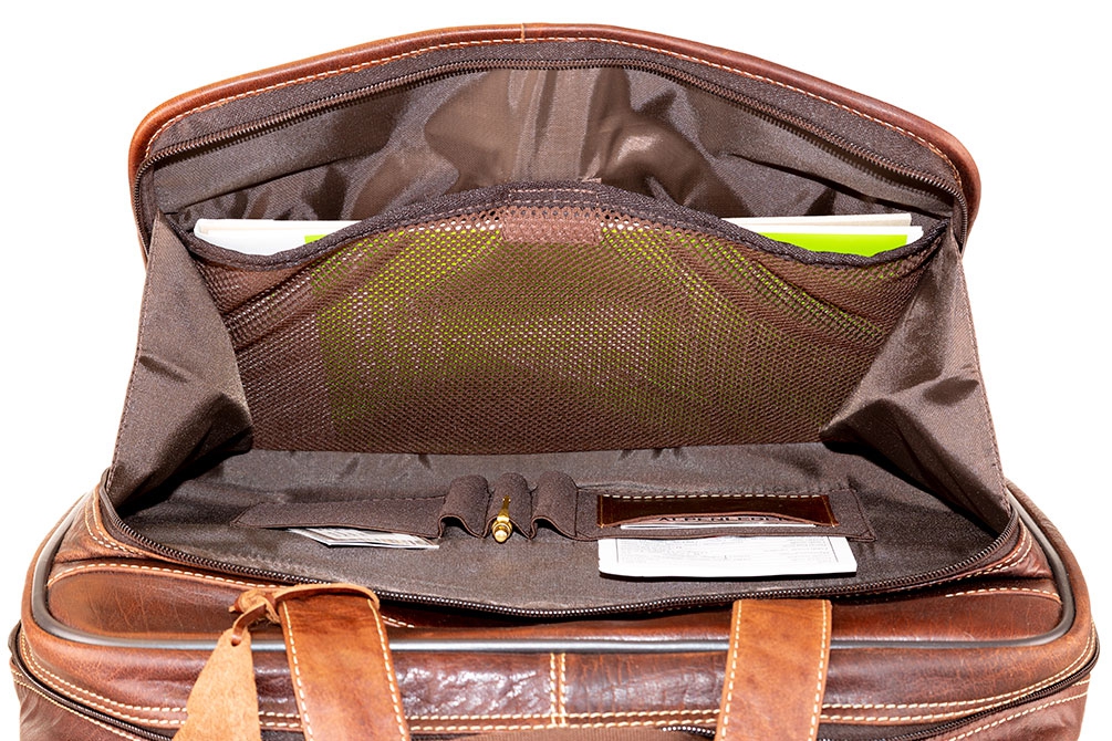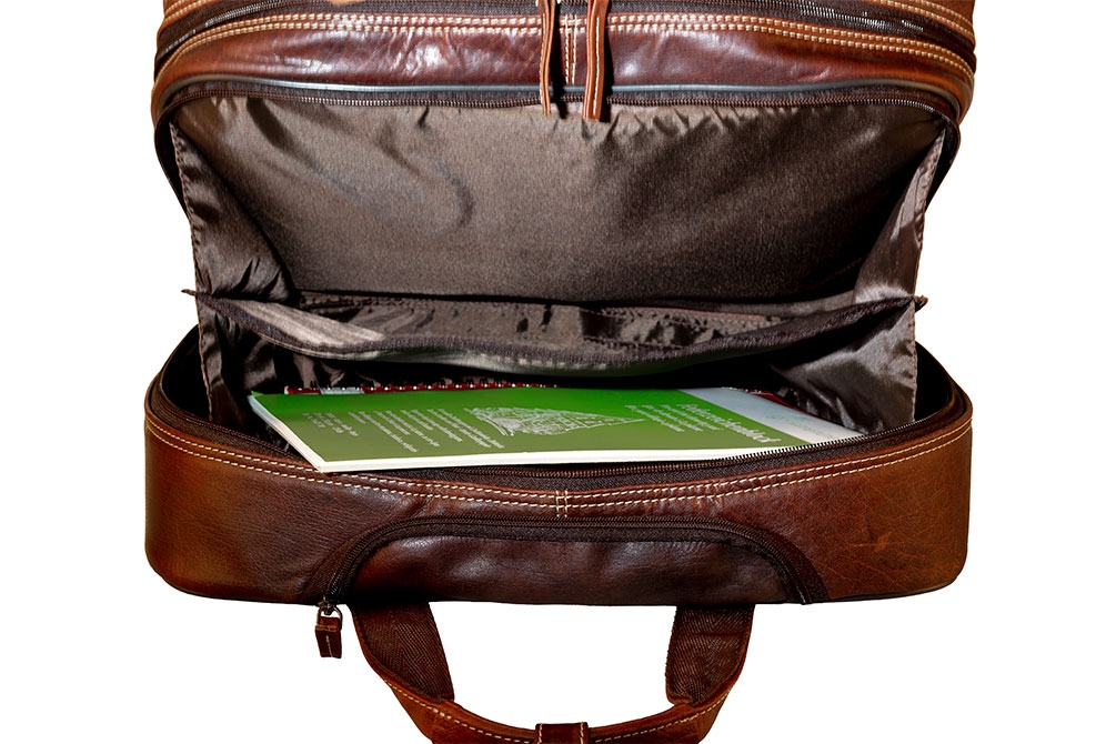 Dva velké prostory se zajištěním na zip. Jeden je vybaven pouzdrem na notebook velikosti 38 x 28 cm. Na přední straně je umístěna kapsa na zip. Přihrádka na dokumenty velikosti A4, menší kapsa na psací potřeby a menší doklady.